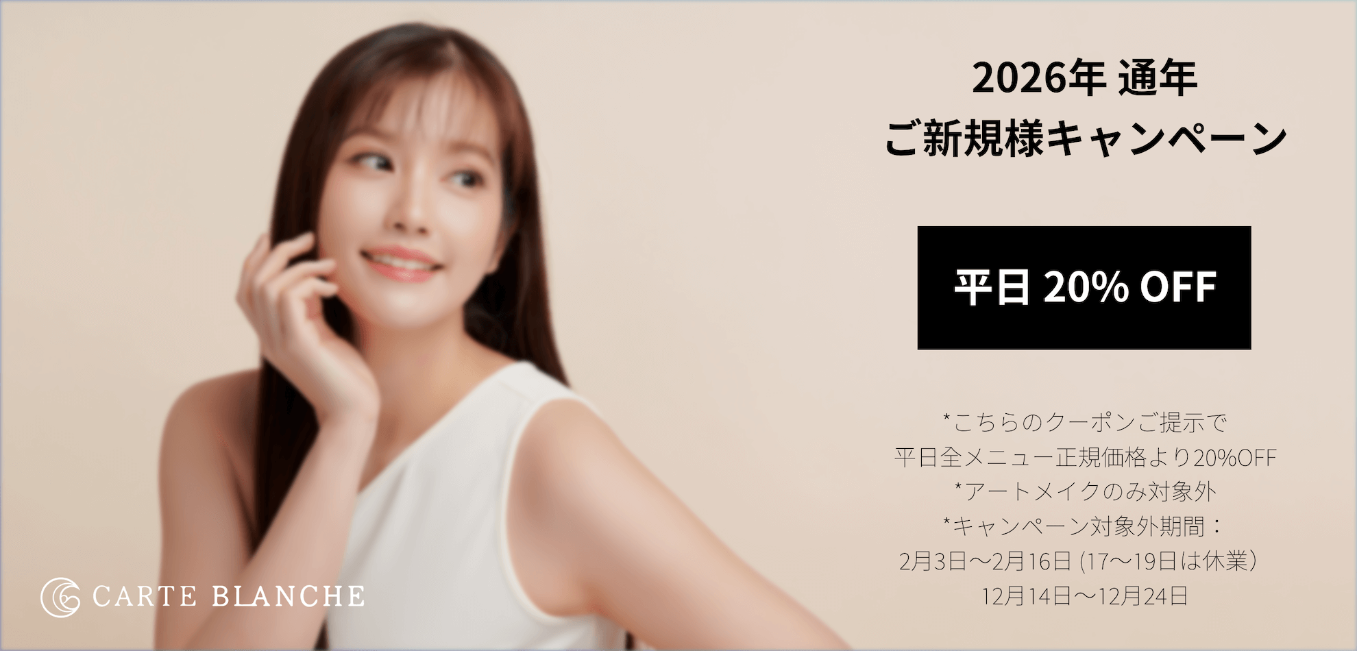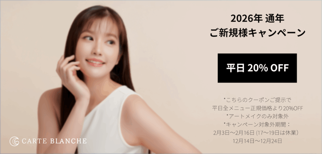 この画面を入店時に担当スタッフにご提示で ↓ ご新規様平日全メニュー20%オフ!(アートメイクは対象外)